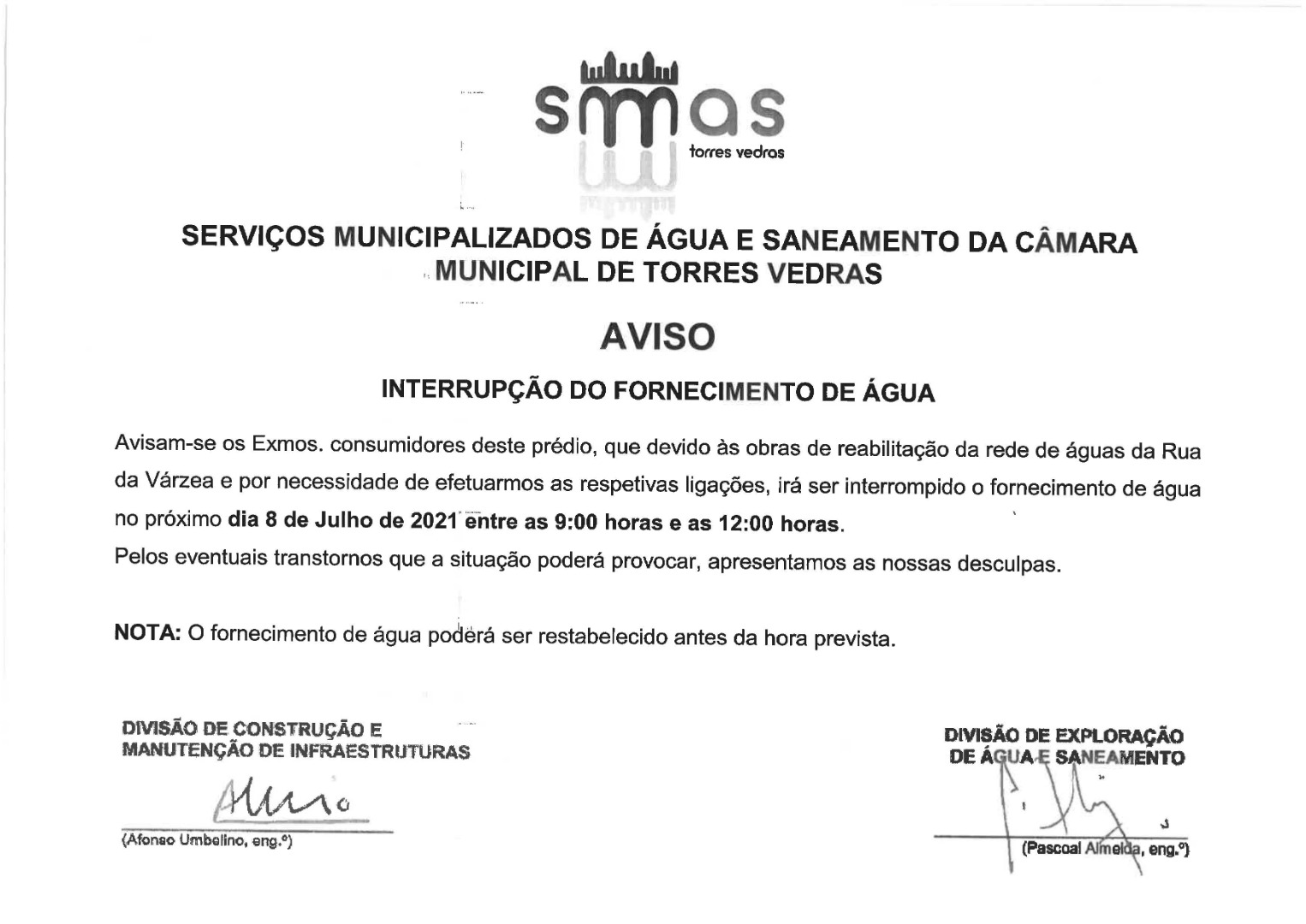 Avisam-se os Exmos. consumidores que devido às obras de reabilitação da rede de águas da Rua da Várzea, Rua da Horta Nova. Travessa do Torres e Rua Cavaleiros da Espora Dourada e por necessidade de efetuarmos as respetivas ligações, irá ser interrompido o fornecimento de água no próximo dia 8 de Julho de 2021 entre as 9:00 horas e as 12:00 horas.